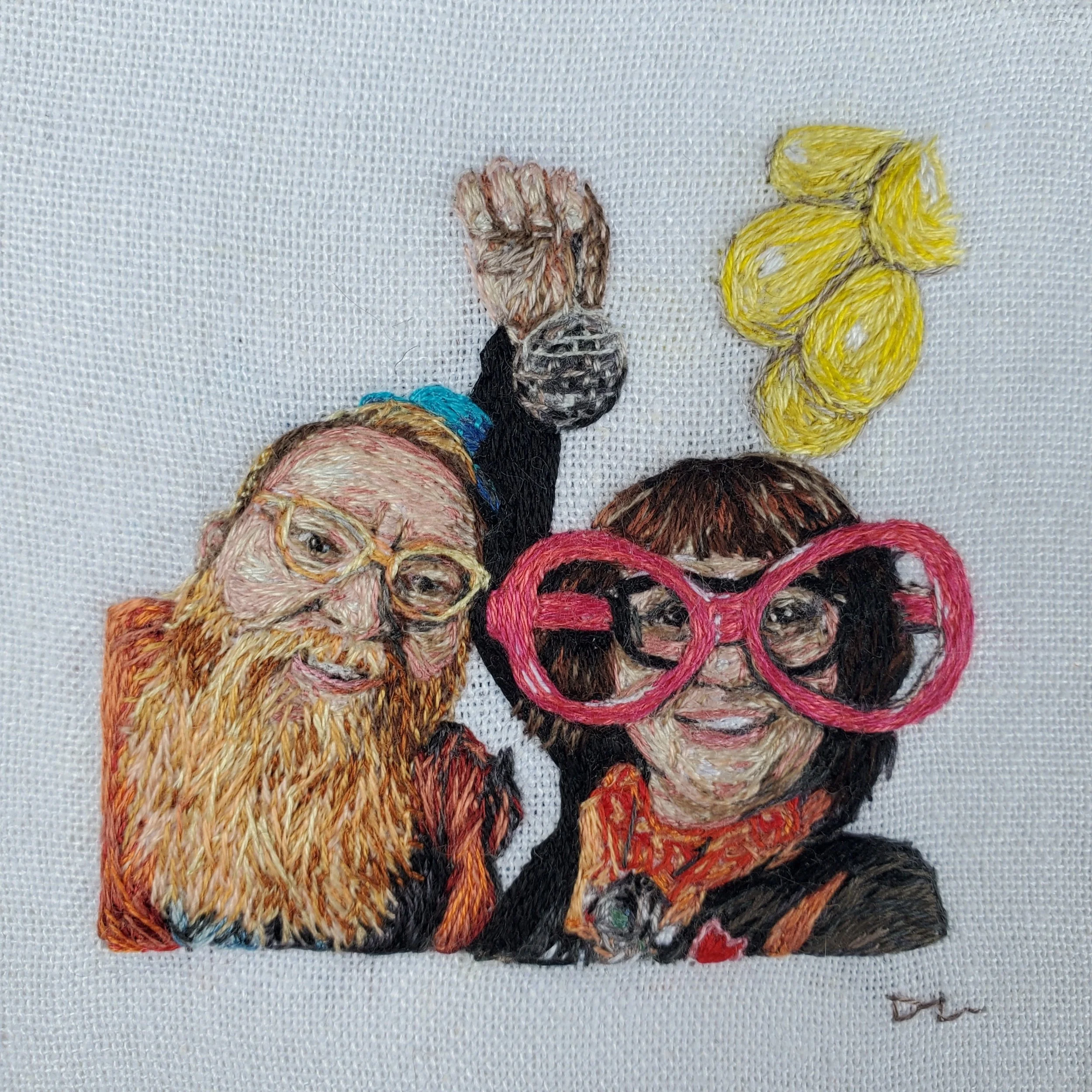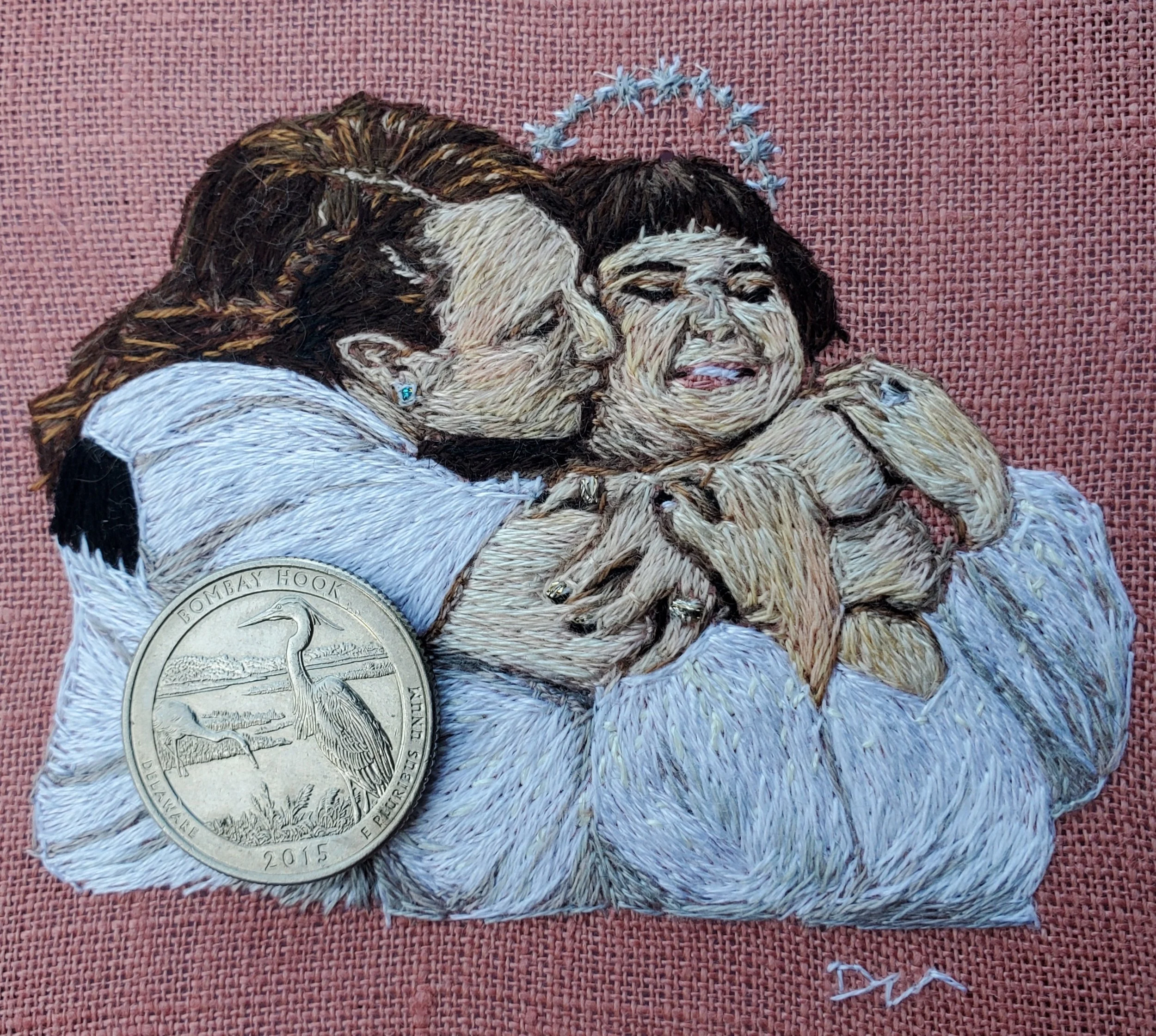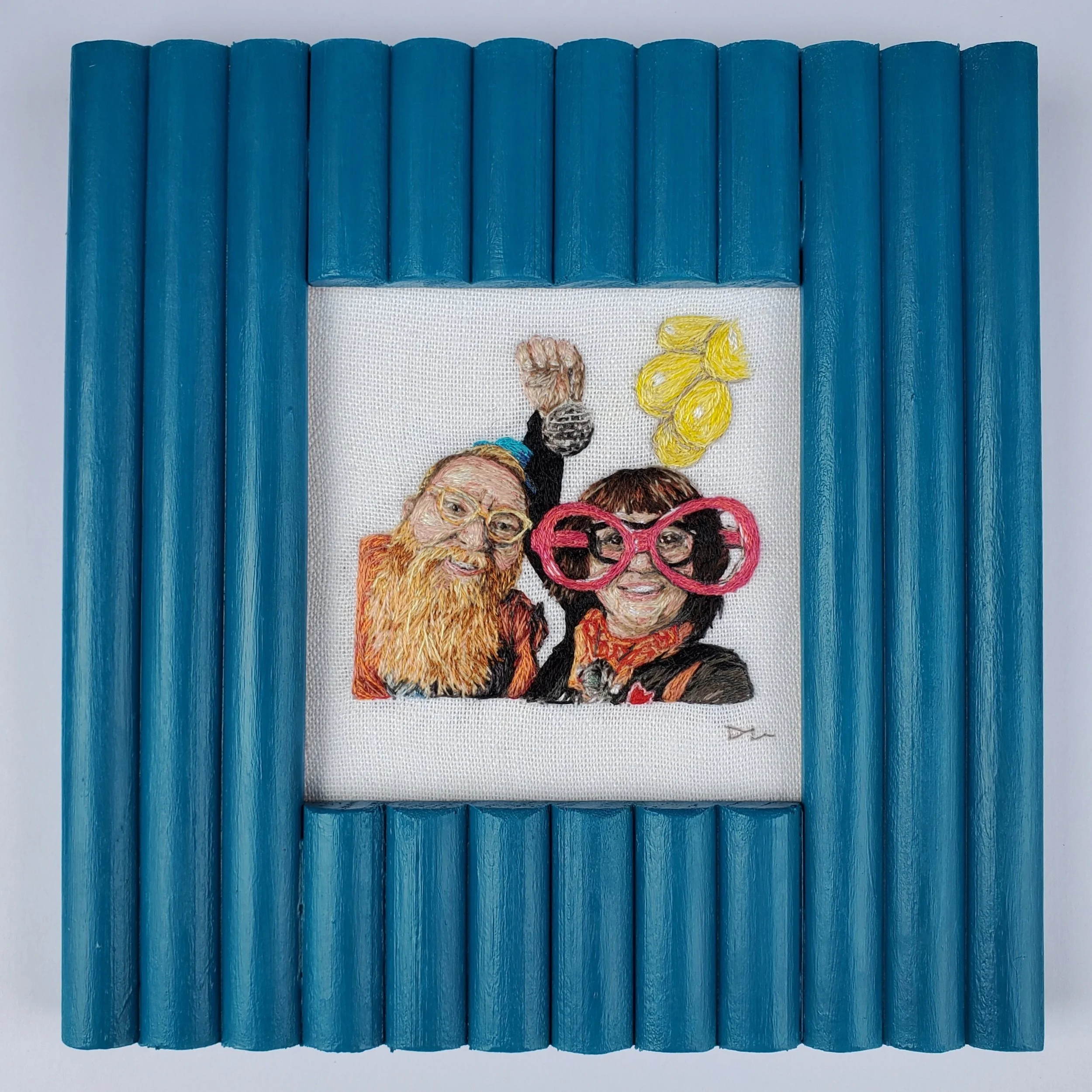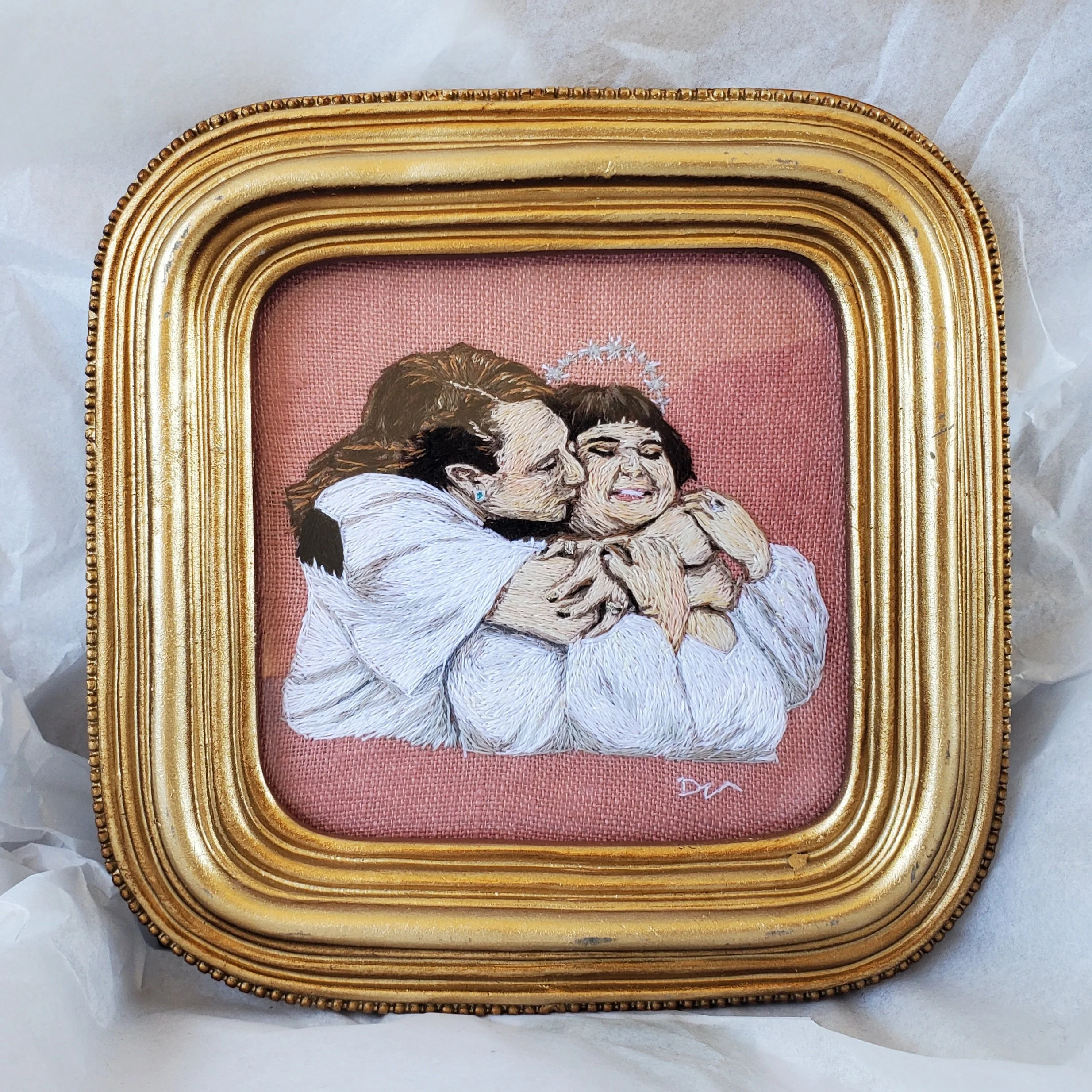 Miniature portrait of two people hand embroidered onto linen in a color complementary to your subjects. It comes mounted in a 4-inch hoop or small frame. Great wedding or anniversary gift! I will need photos from you to work with. If you have questions about photos, please ask! The embroidered area is about 2 inches by 2 inches.